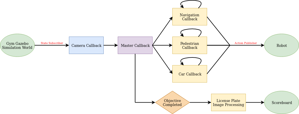Each "callback" is essentially an asychronously running method responsible for handling a specific aspect of our robots operation. For example, our "Car Callback" handles capturing images of the parked cars, as well as avoiding the roaming truck which circles the middle track. Our "Navigation Callback" uses the camera feed to stay centered within the road, and to properly stop at crosswalks. After we have successfully navigated the course, our system has captured multiple images of each parked car we have passed.