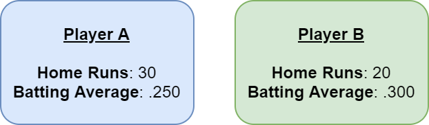 To make well informed decisions, I needed to reduce all of the projected statistics into one single number. But the tricky part was comparing metrics that are so fundamentally different. How would one compare stolen bases to strikeouts? Walks to home runs? Lets look at an example with two different hypothetical players, with their Home Run and Batting Average projections for the following year.