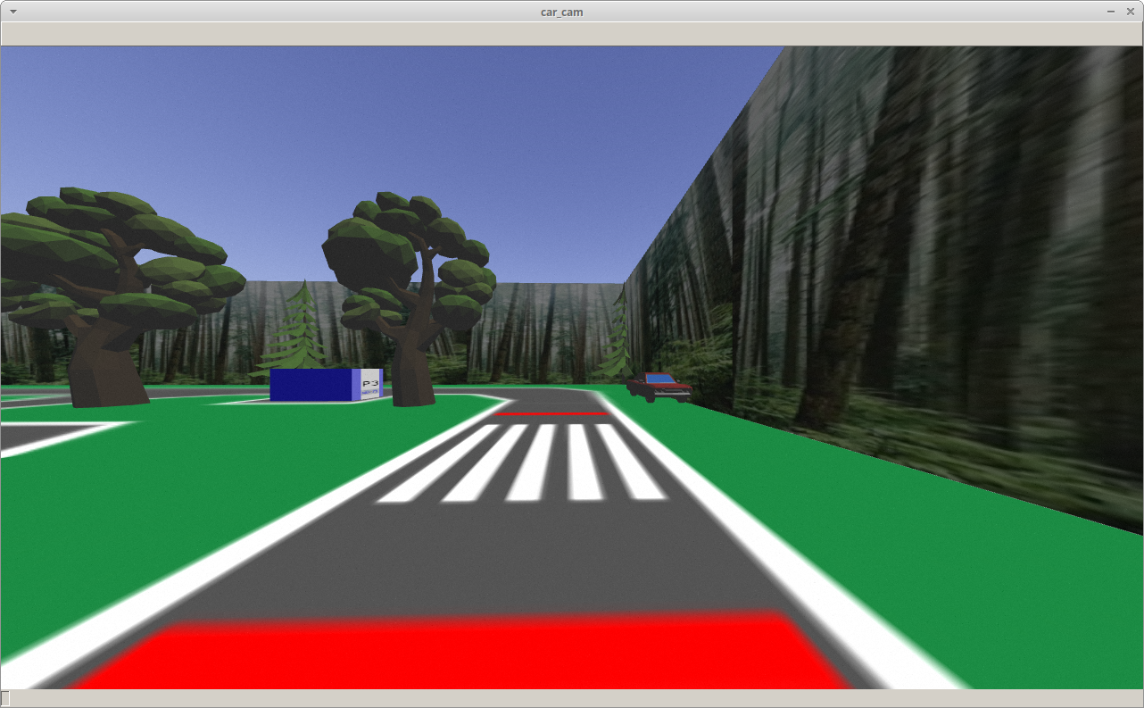 The operation of our robot relied solely on the camera input feed it received from the virtual world. Within the gazebo simulation, a camera mounted on the top of the robot facing forwards continuously fed our system with an image feed. The following image shows an example of the frame we would recive back.