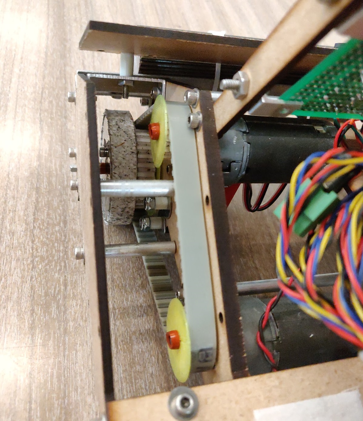 We chose to use a timing belt to supply each wheel with power from two motors, geared using a 2:1 ratio. We chose this design to maximize the speed we were able to travel at, while still meeting our basic torque requirements to travel up inclined surfaces.