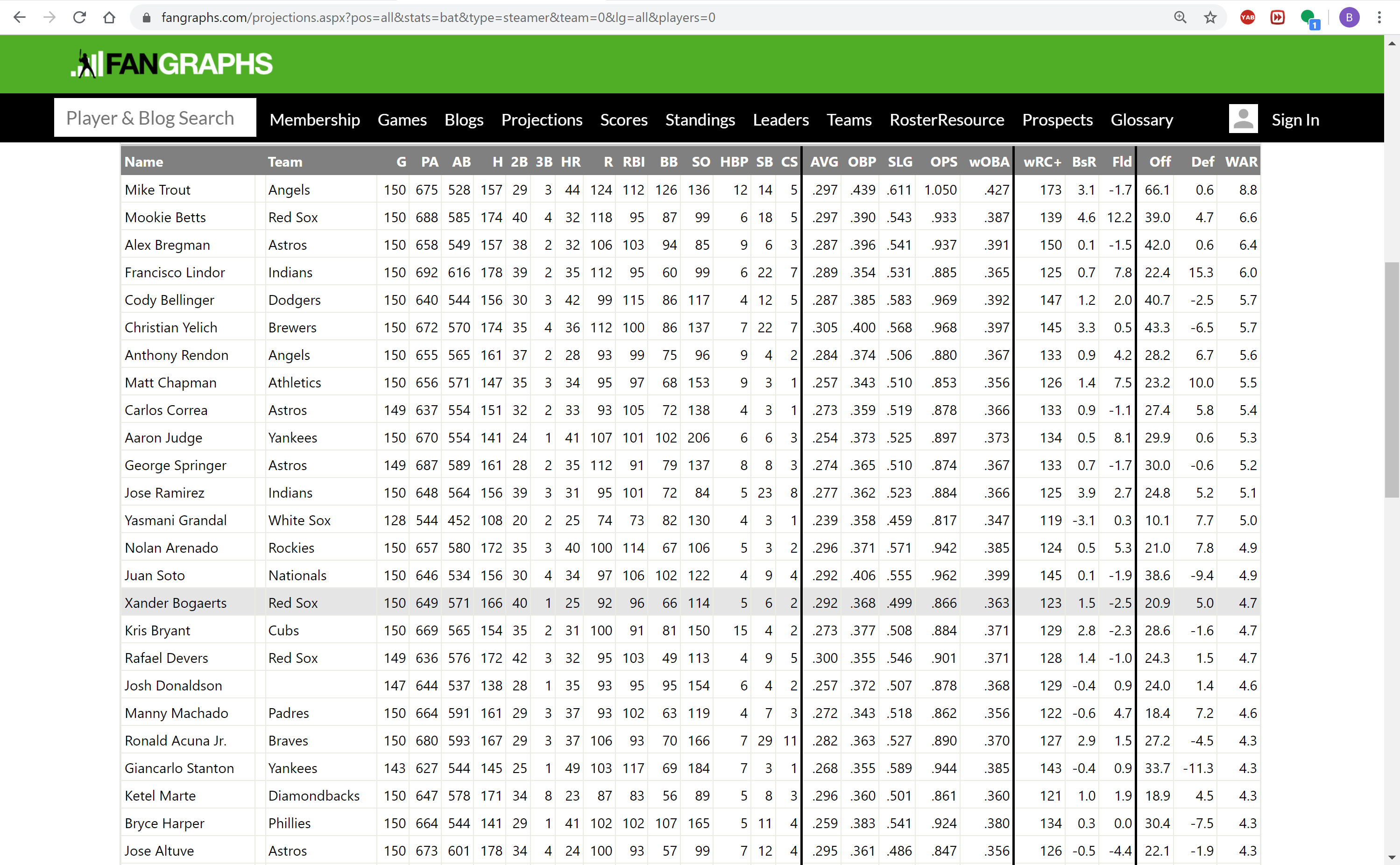 There are countless websites which offer free player projections, organized by category. For my projections, I used Python's BeautifulSoup library to scrape fangraphs.com for its "Steamer" fantasy baseball projections. Once I gathered all the data for each player, I saved the content into a Microsoft SQL server for easy table manipulation later on. The following images show the Steamer projections, as well as the saved table within Microsoft SQL. Saving all of the information here made the data very easily accessible from the Visual C# program I used to calculated performance estimates.