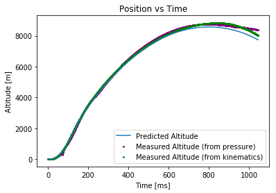 Correctly measuring the altitude of our rocket in-flight is vital to the deployment of our recovery system after we have reached our target apogee. Since we cannot directly measure pressure, we must use the kinematics of the flight path, augmented with a Kalman filter to accurately predict and measure where we are in our flight path. We are still in the process of verifying our algorithm's functionality, and testing its implementation throughly. Below are the results we have obtained thus far, using data gathered from our last 30,000 ft rocket "Sky Pilot" which launched this past year at the IREC Competition in New Mexico.