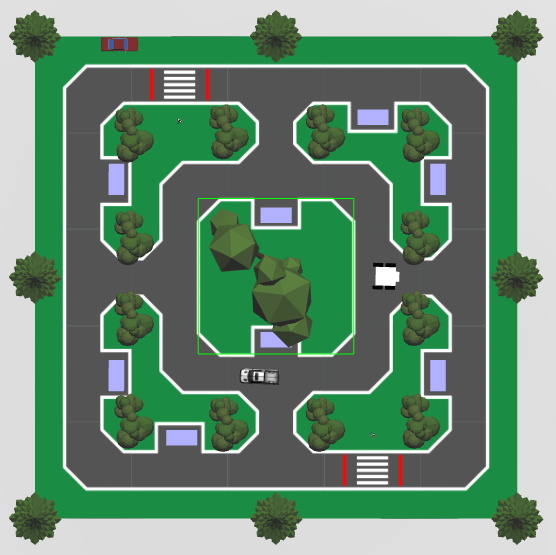 ENPH 353 Final ReportThe following image captures a top view of the gazebo simulation world that our robot operated in. Our robot (in white) is shown at its starting position on the road and the "parked cars" are represented by the blue rectangles placed throughout the course at various "parking locations". Our objective was to navigate the roads, and collect the license plate information of all parked cars along our path.